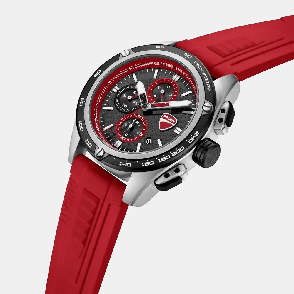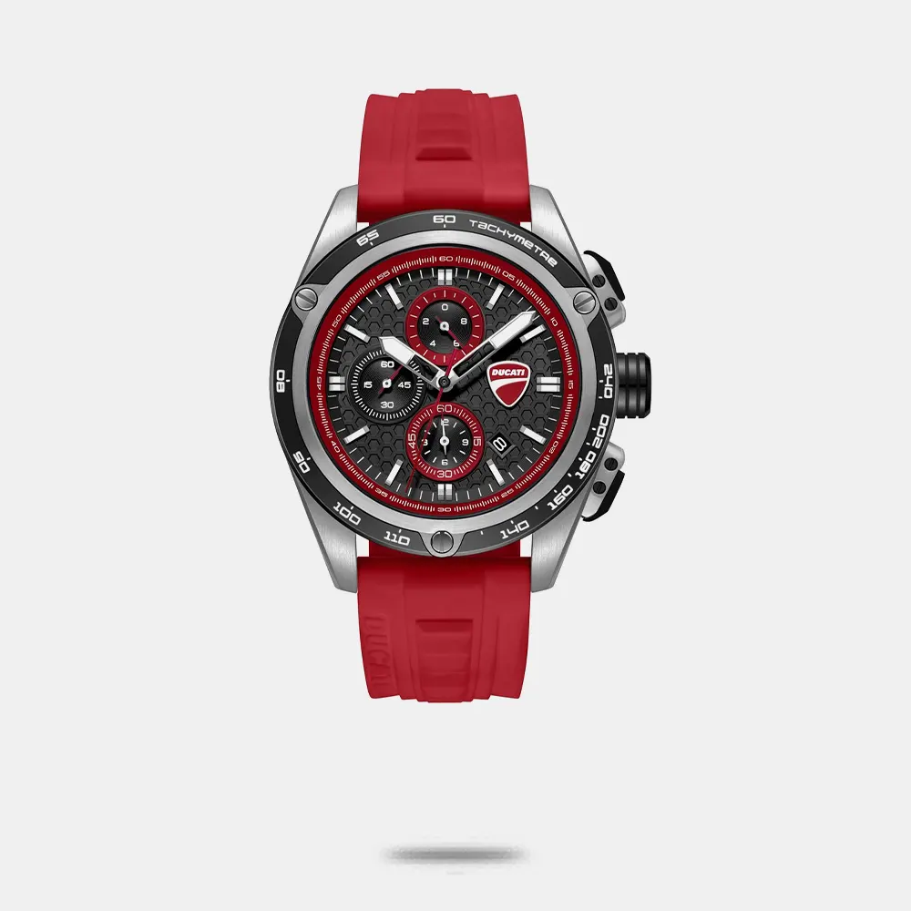 A machine that never backs off, DT028 commands attention with its 44 x 52mm stainless steel case. The black matte dial is cut with a dynamic honeycomb texture, overlaid with red-ringed sub-dials that echo Ducati’s instrument clusters. At 3 o’clock, the Ducati logo marks its territory – unmistakable and proud. The tachymeter bezel in steel and black frames the action. The crown and pushers are IP black – rugged and built for control. Finished with a bold red silicone strap, DT028 delivers the energy, detail, and edge every Ducati fan looks for.