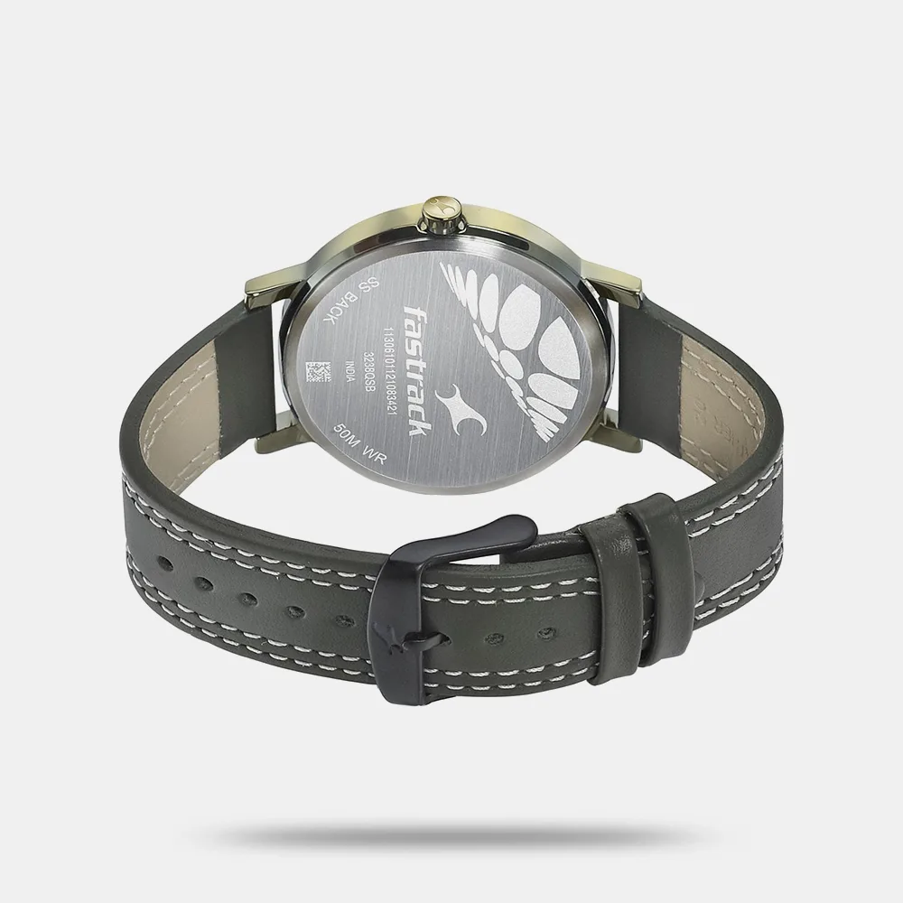 Elevate your accessory collection with this men’s casual analog watch from the Dial it up collection by Fastrack. It has a green round stick dial. This multifunction watch features a crown for time adjustment. The genuine leather strap comes in a grey hue that further elevates the look of the watch. Besides, it is completed with a buckle clasp to ensure a secure fit on the wrist. It is water-resistant up to 50 m. It has stick needle, Quartz movement and a dial diameter of 43 mm. It shows the day and date accurately.