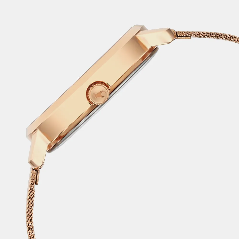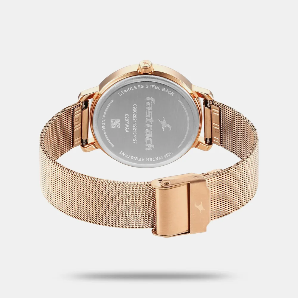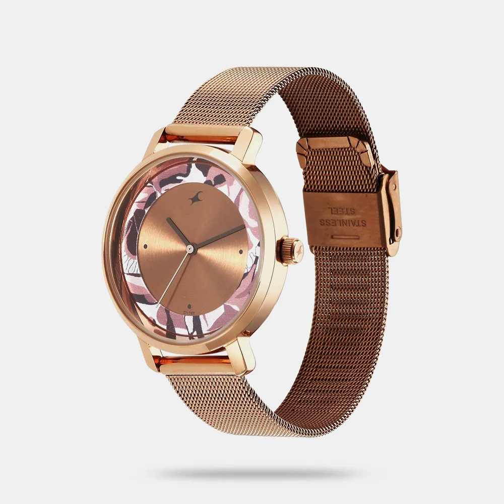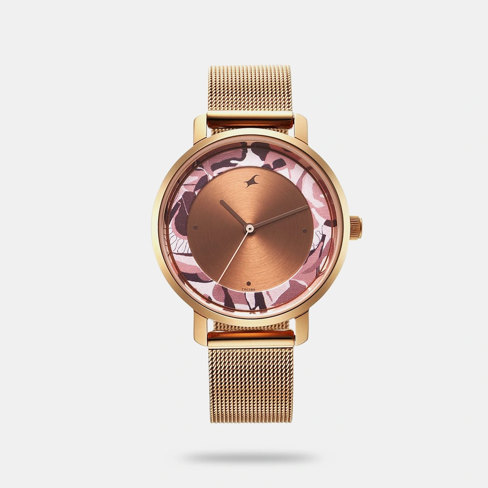 Make a bold statement with the Fastrack Camo Collection watch designed for the modern girl who embraces individuality. This eye-catching timepiece features a warm rose gold dial layered over an abstract camo floral print that radiates confidence and creativity. The sleek mesh strap in matching rose gold tones complements the artistic dial while ensuring a comfortable, stylish fit. Perfect for trendsetters who seek both function and flair, this piece elevates everyday outfits with effortless elegance.