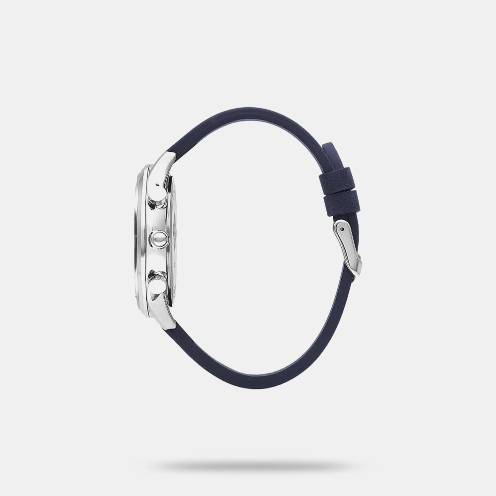 Round Super Metal Silver case with Multi Function display, Dark Blue dial 46 mm case diameter, PE933 movement, 5 ATM water-resistant Dark Blue Leather bracelet with Buckle