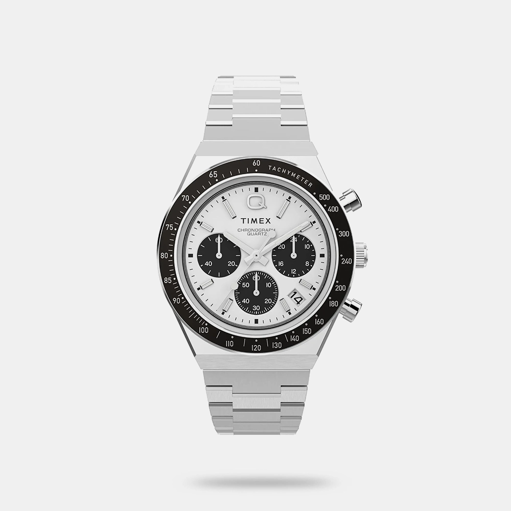 Roar across the finish line with our high-performing Q Timex Chronograph. Inspired by the original motoring watches that graced the tracks of Europe’s most iconic races, this timepiece celebrates the endurance of our legendary 1970s Q Timex. An ultra-precise chronograph movement and tachymeter bezel recreate the finesse and function of a true racing watch, allowing you to determine elapsed time and average speed like the greatest daredevils in motorsports. Contrasting sub-dials, a date feature, hand-applied dimensional indices, and an updated Q Timex logo stand beautifully against a white dial, while a stainless-steel crown and brushed and polished 40mm stainless-steel case bring dynamism and durability to its retro construction. Infinitely wearable, it presents with a sleek stainless-steel bracelet.