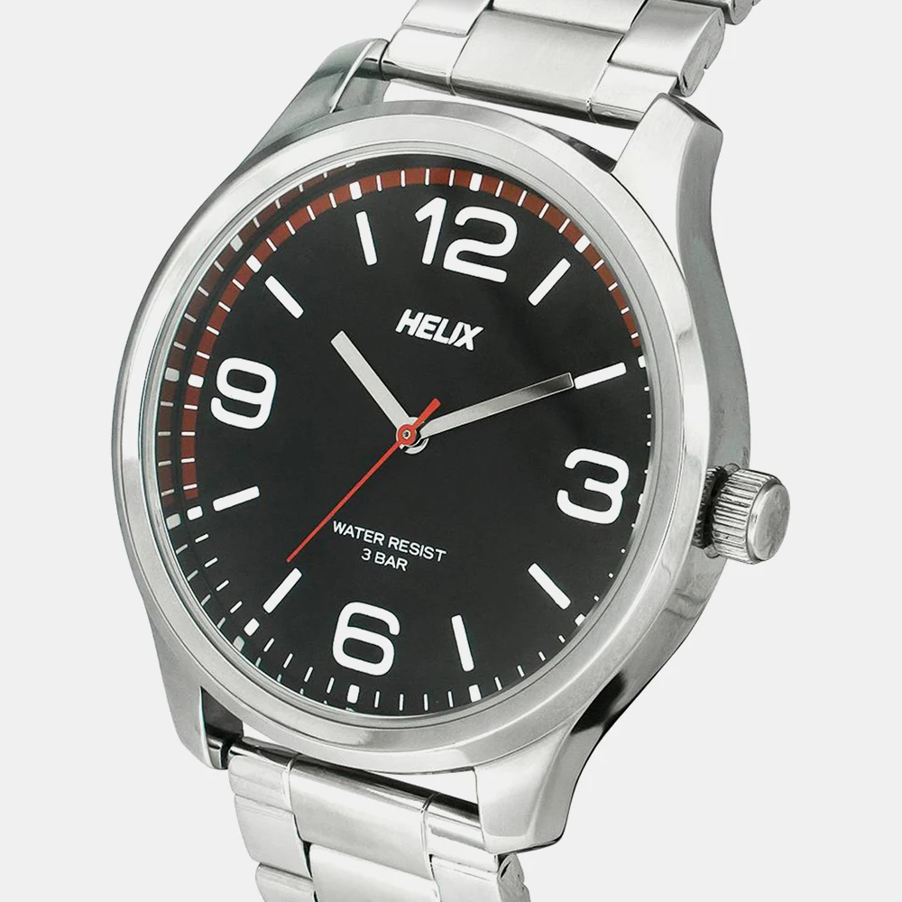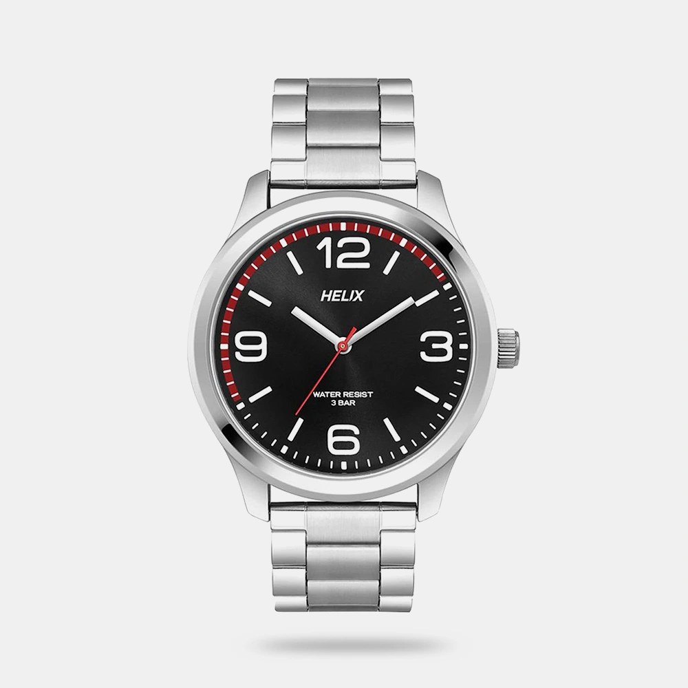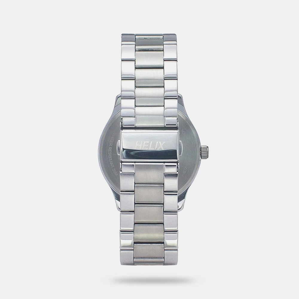 Set your fashion parameters high with this men’s analog watch from the Valentine’s Day collection by Helix. The black round dial is housed in a 45.5 mm case. It exudes plain three hands and a crown for time adjustment. The stainless steel strap vaunts a silver hue that enhances the look of the watch. Furthermore, it is completed with a push-button clasp to ensure a secure fit on the wrist.